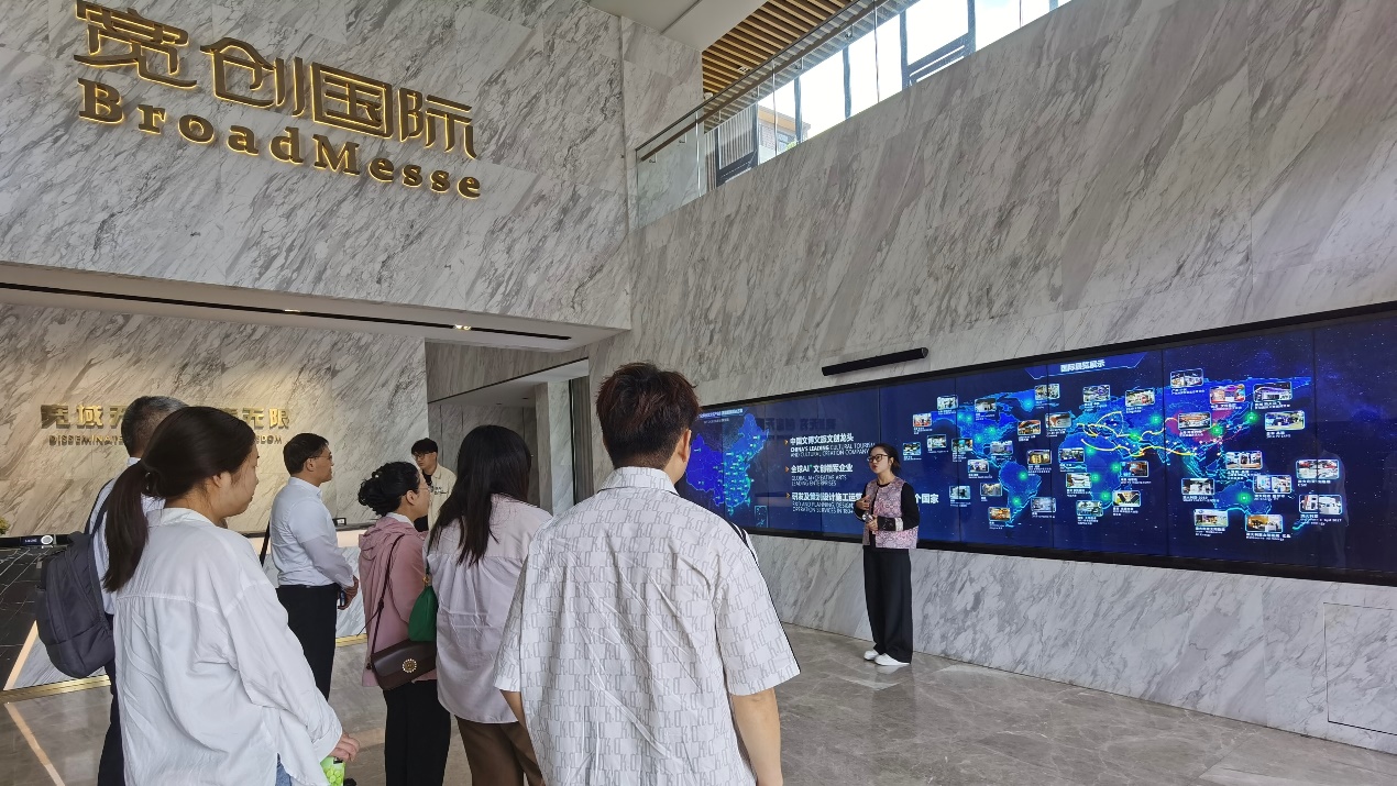 在宽创国际市场总监张怡的陪同下,大家先后考察了宽创国际魔墙展示区、文旅综合体设计院、多媒体院、元宇宙展厅等,通过现场学习、沉浸式体验,感受到了“以文化创意赋能空间载体,以科技创新助力智能展示”的多维度体验技术,学习了宽创国际在文化科技、文博文旅产业、国际会展等领域的创新发展理念与成功经验。