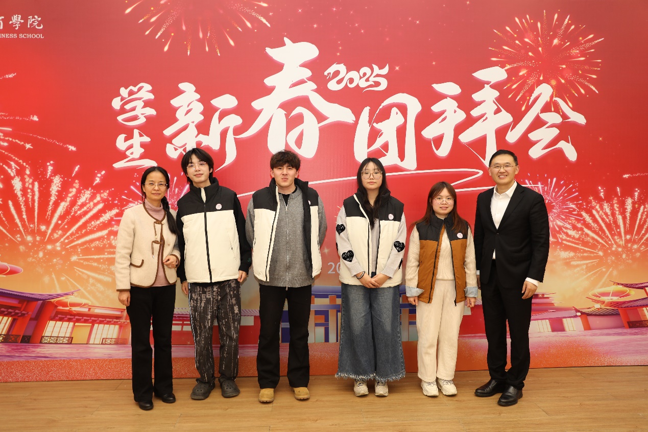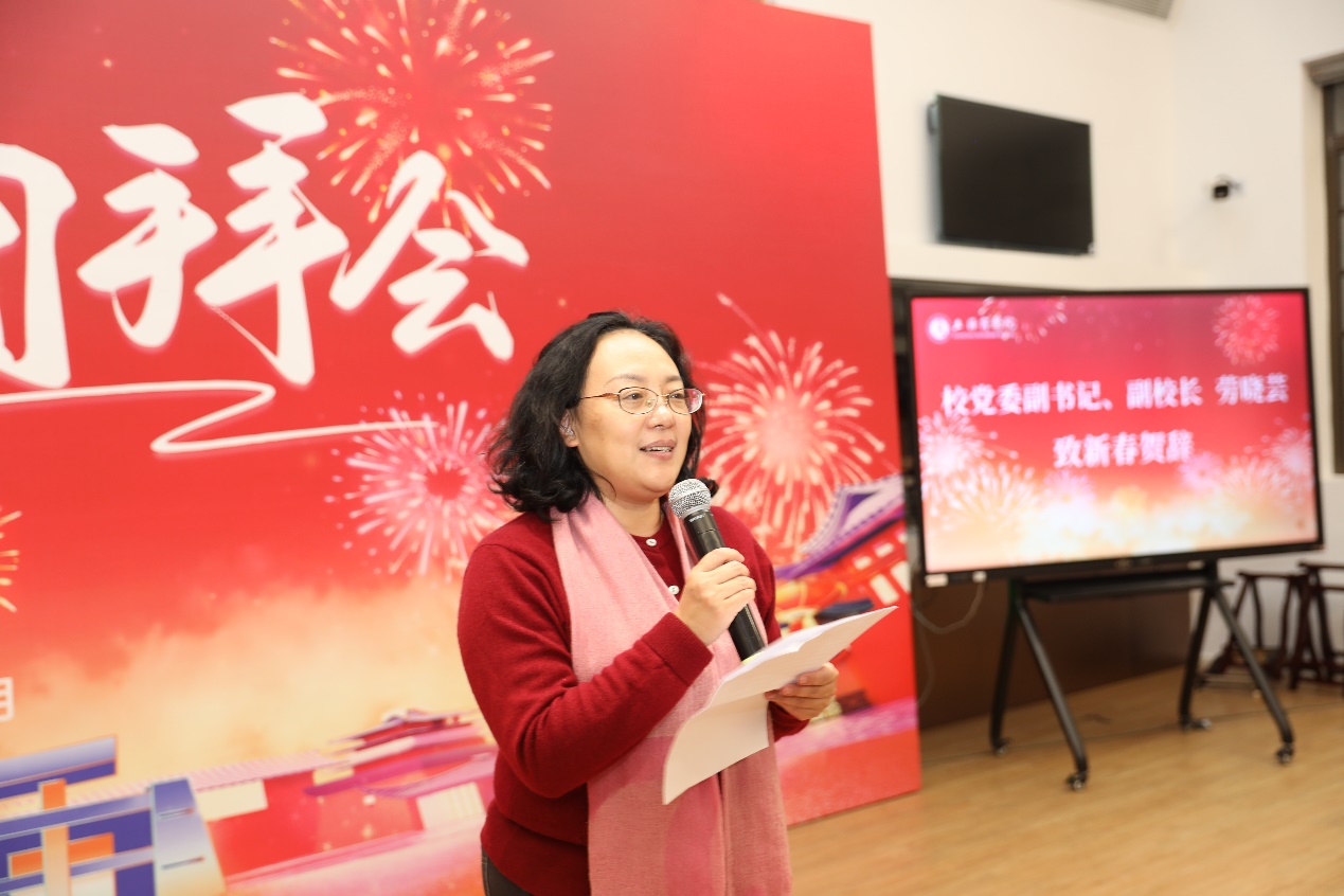 团拜会上劳晓芸致新春贺词。她向留校过年学生表达慰问,回顾了过去一年学校深入学习贯彻党的二十届三中全会精神和全国教育大会精神,落实立德树人根本任务,为党育人、为国育才,努力开创学校高质量发展新局面的情况,在党建工作、学科建设、人才培养、科学研究等方面取得的新突破新进步。劳晓芸指出,2025年是国家“十四五”规划收官之年,“十五五”规划的谋划之年,也是学校建校75周年。在特殊时刻里,希望同学们铭记父母养育之恩、亲友支持之情、老师教诲之功、同窗陪伴之谊,拥有面对困难和挑战的勇气与智慧,勇敢追求自己的梦想与目标,及时关注社会的变化和发展,积极投身于校园内外的多元交流与合作,奋力谱写教育强国上商篇章!