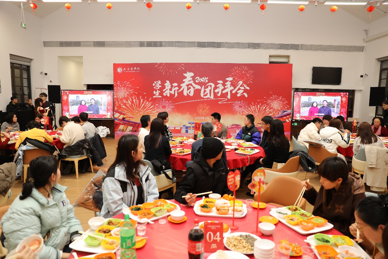龙腾旧岁祥云起,蛇舞新春福气来。1月22日,学校在漕宝路校区食堂二楼隆重举行2025学生新春团拜会。校党委副书记陈晓峰,校党委副书记、副校长劳晓芸,校党委副书记、纪委书记张洁,副校长张绍华,各学院党政领导、相关职能部门负责人、教师代表与留校学生欢聚一堂,喜迎乙巳新春。活动现场张灯结彩,喜庆祥和,洋溢着浓浓的年味。在大气磅礴的古筝合奏《盛世国乐》中,学生新年团拜会缓缓拉开序幕。