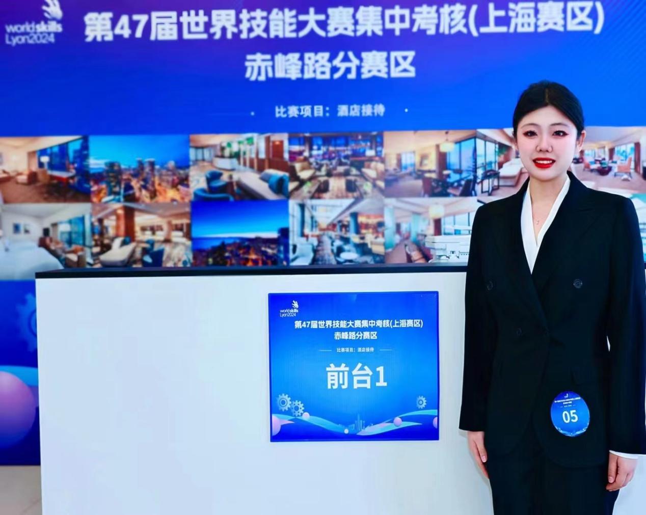 最终,在学校教练组长姜红教授和团队支持下,她怀揣着奶奶的期待和赤子的梦想,代表上海在中华人民共和国第二届职业技能大赛酒店接待赛项上与其他来自26个省份的佼佼者们同台竞技,凭借着她独特的亲和力和扎实的专业水平,一路乘风破浪,摘得金牌并获得全国技术能手称号,进入国家集训队。得到了来自解放日报、文汇报、教育在线、上海教育、劳动报、新民晚报等10余家媒体报道,参与了上海教育电视台“一起来成长”节目录制分享比赛经历,覆盖点击率和收看率超万次。她期待着在今年九月,在法国里昂,代表中国站在世界的舞台上,展现中国青年的青春风采,发出中国青年的有力声音!