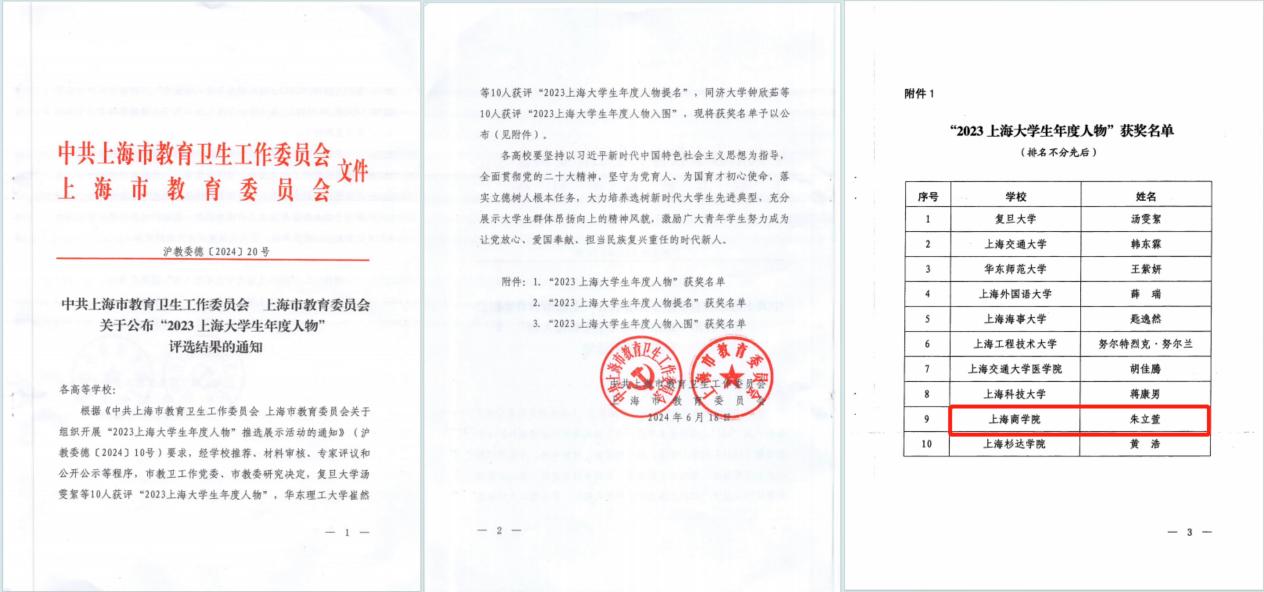根据《中共上海市教育卫生工作委员会、上海市教育委员会关于组织开展“2023上海大学生年度人物”推选展示活动的通知》(沪教委德〔2024〕10号)要求,为深入挖掘和宣传表彰大学生先进典型,充分发挥先进典型的示范引领作用,在全社会营造促进大学生健康成长的良好环境,经学校推荐、材料审核、专家评议和公开公示等程序,市教卫工作党委、市教委研究决定共推选出“2023上海大学生年度人物”10名、“2023上海大学生年度人物提名”10名、“2023上海大学生年度人物入围”10名,我校朱立萱同学经过层层选拔,最终荣获“2023上海大学生年度人物”称号。