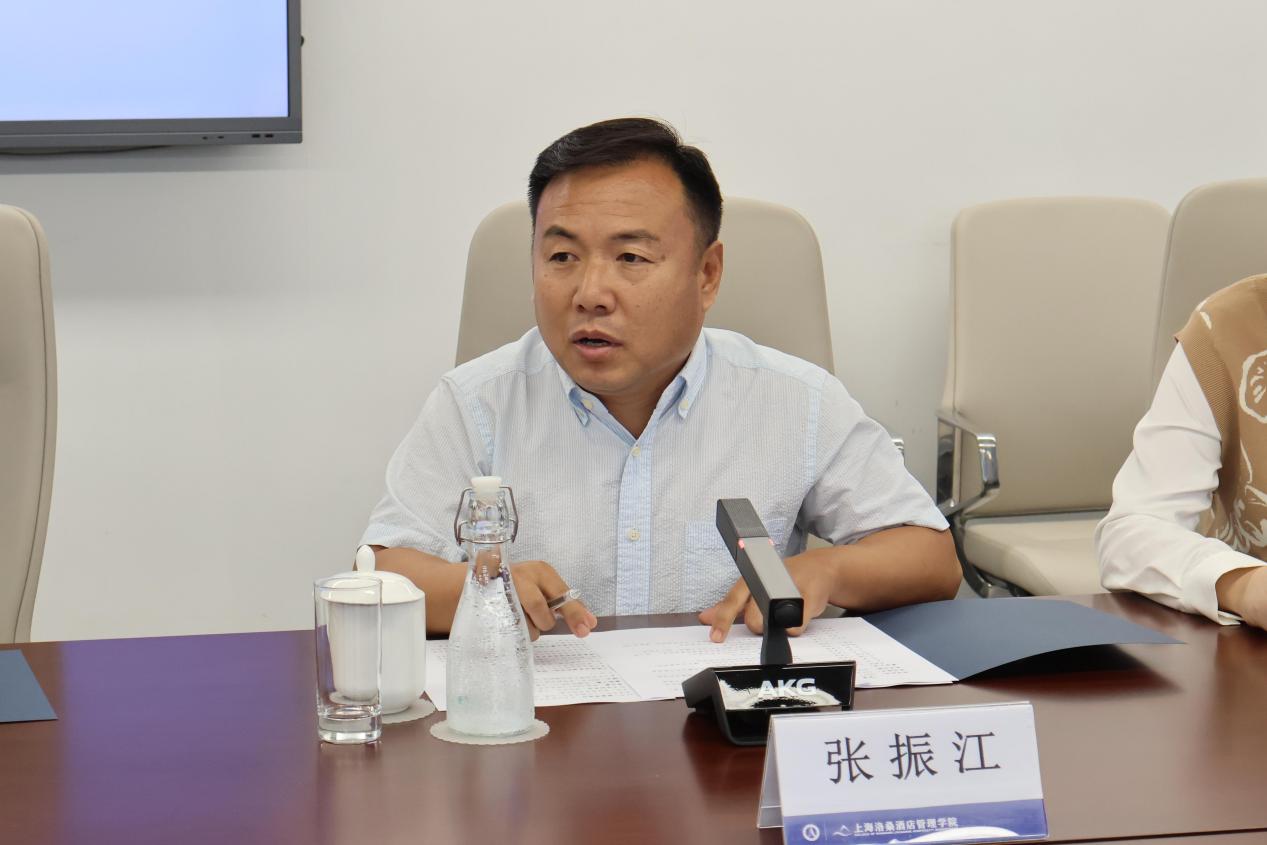 张振江向代表团介绍了上海商学院的办校历史及办学状况,并从专业设置、科研成果、国际合作、社会服务等方面展开详细介绍。