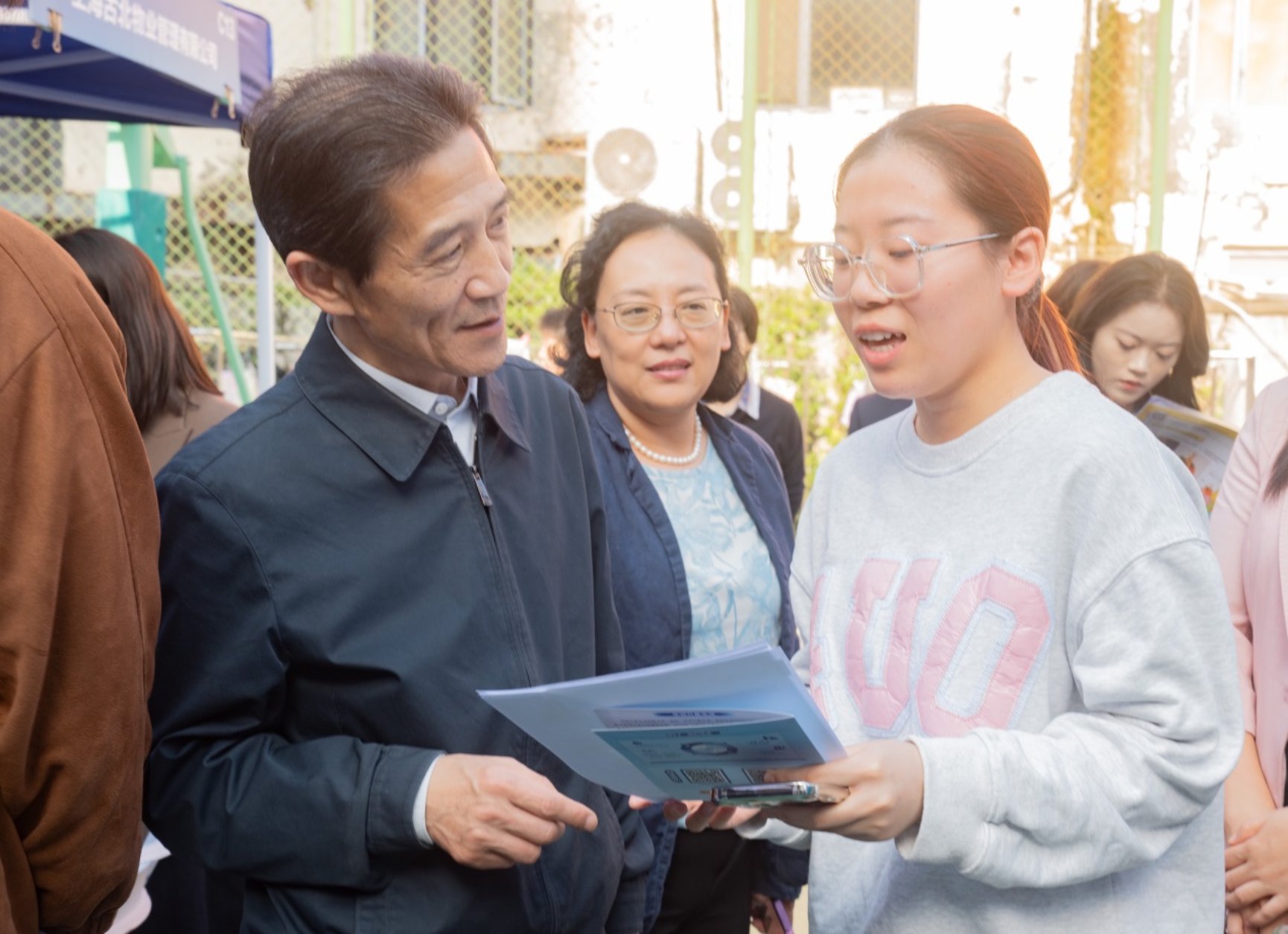 在招聘展位前,校领导们详细询问企业规模、岗位需求及人才储备情况,对用人单位表示欢迎和感谢。他们与现场毕业生们进行了亲切交流,详细了解同学们的求职意愿和签约情况,鼓励毕业生抓住机遇,尽快找到适合自己的工作岗位,在实现自我发展的同时,勇于承担时代赋予的责任与担当。