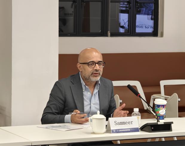 随后,Sameer详细介绍了INSEAD的全球布局、学科优势及办学理念,并由战略系主任陈国立介绍XR-AI创新中心的建设成果与应用方向。他谈到,在数字化转型浪潮下,商科教育需加强前沿技术与学科融合,INSEAD的全球视野与创新资源,与上海商学院的本土实践优势高度契合,合作空间广阔。