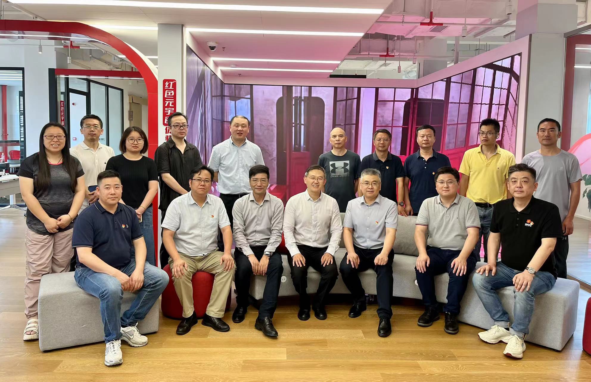 随后,与会人员共同参观了漕宝路校区维修工程建设成果,浏览校园综合楼、学生宿舍、图书馆、食堂及校园景观,交流项目建设管理经验。在图书馆三楼,商务信息学院党总支书记宋晓光为与会者演示了元宇宙建设项目,讲解一大会址线上游览、沉浸式体验等项目,两校参会人员共同在一大会址沉浸式体验区合影。
