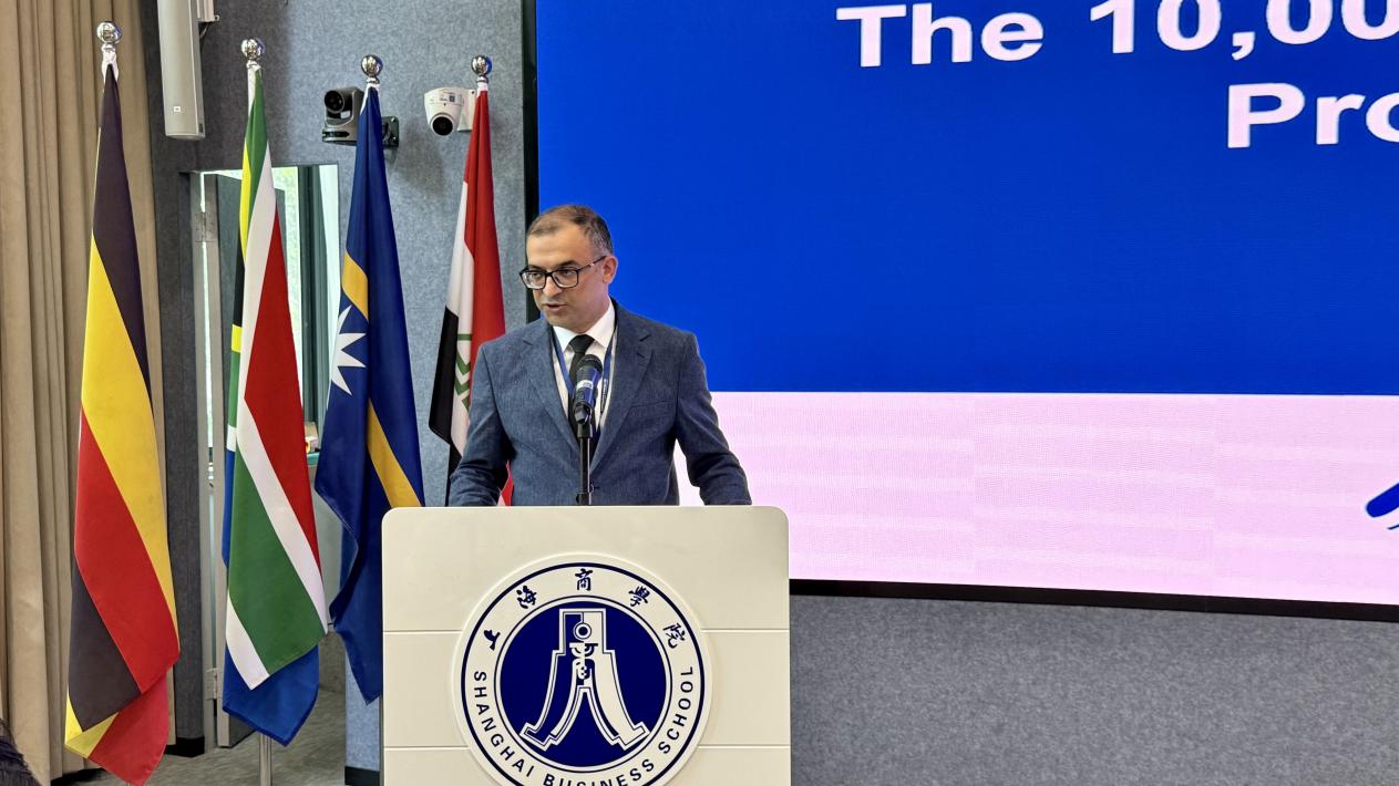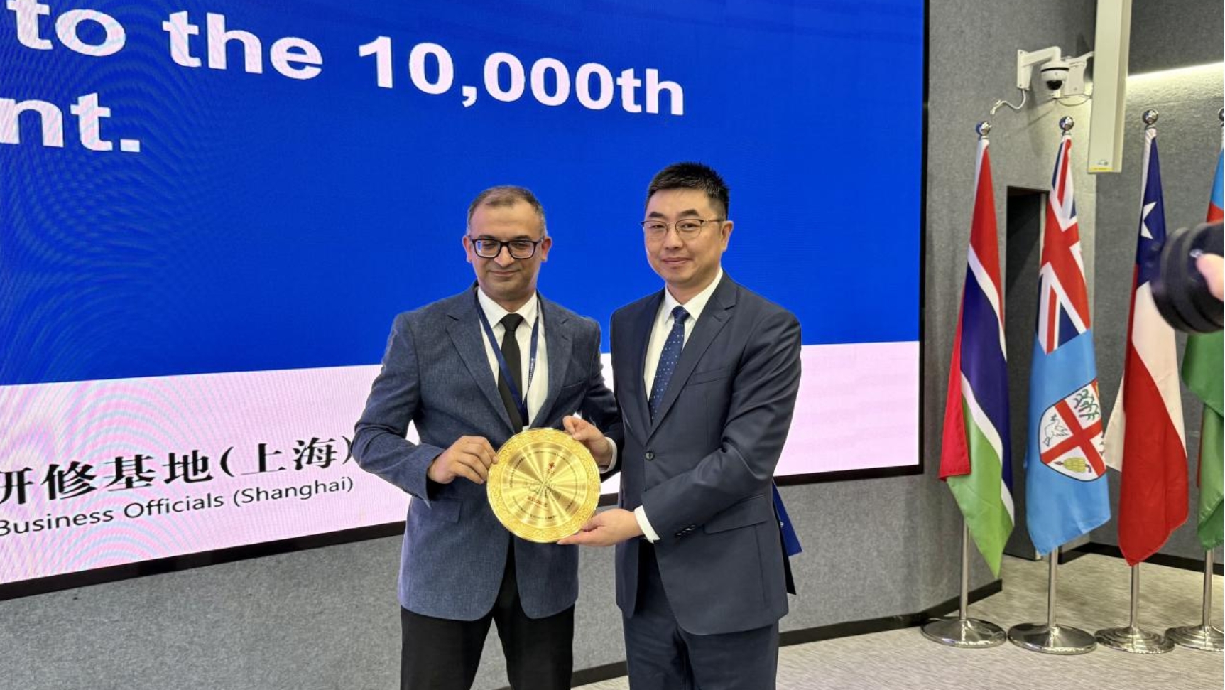 典礼上,阿塞拜疆经济部项目管理处副处长武萨尔·加拉耶夫作为上海基地第10000名参训学员,被授予特别定制的纪念盘。武萨尔在发言中深情表示:“这一身份既承载荣誉更意味着责任”。他高度评价本期研修班课程聚焦的基建融资、智慧城市与绿色转型等议题,为发展中国家应对气候变化贡献了“中国方案”,并强调中国在制度设计、国家协调方面的经验对阿塞拜疆经济多元化具有重要借鉴价值。武萨尔指出,“中阿基建贸易合作正成为区域一体化关键引擎”,上海基地第10000名学员的诞生“标志着中国发展经验通过制度化、规模化路径惠及全球”。