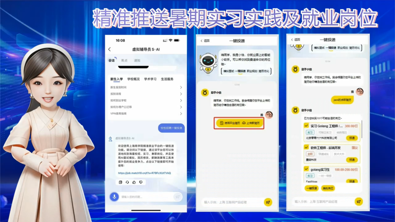 今年3月,我校推出虚拟辅导员数字化就业服务平台,设立“就业补给站”模块,根据学生个人数据,一键生成并优化简历,精准推送适合的岗位,极大提升我校就业指导工作的有效性和科学性。为助力上商青年就业服务工作,学生处依托虚拟辅导员2.0系统推出“暑期实习岗位”和“就业指导”模块,以数字化赋能毕业生精准就业。