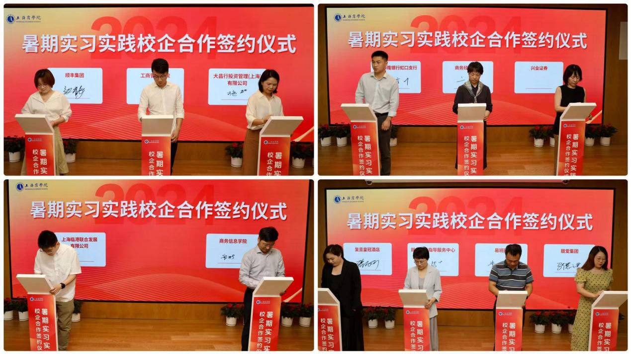 工商管理学院与大昌行投资管理有限公司、顺丰集团,商务经济学院与浙江泰隆银行虹口支行、兴业证券上海分公司,商务信息学院与上海临港联合发展有限公司,就业创业指导服务中心与易班网、胧爱集团、复旦皇冠酒店签约暑期实习实践校企合作协议,开展全方位、全过程、全领域的深度合作,进一步深化落实“双赢、多赢、共赢”的发展理念,为上商青年打造了解国情、关注民生、奉献社会的实践育人平台。