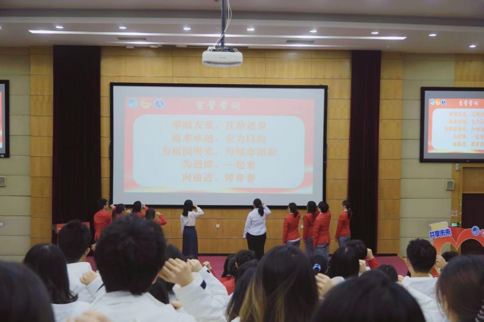铿锵誓言,使命在心。在各二级学院(院区)志愿者领队的带领下,77位上商“小叶子”整齐列队,高举右拳,庄严宣誓:“奉献友爱,互助进步!追求卓越,全力以赴!为祖国争光,为城市添彩!为进博,一起来!向前进,博青春!”誓言铮铮,回荡全场;青春壮志,气贯长虹。他们以铿锵之声凝聚奋进力量,以昂扬之姿展现上商青年响应时代召唤、矢志担当奉献的坚定信念。