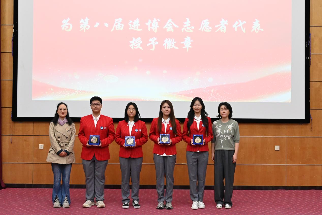 图为党委研究生工作部副部长王韦达与教务处副处长倪琳为第八届进博会志愿者代表授予徽章