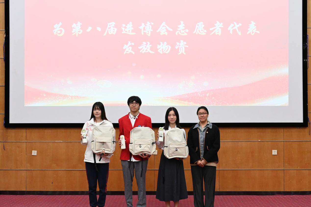 图为后勤保障处副处长孙旭东为第八届进博会志愿者代表发放物资