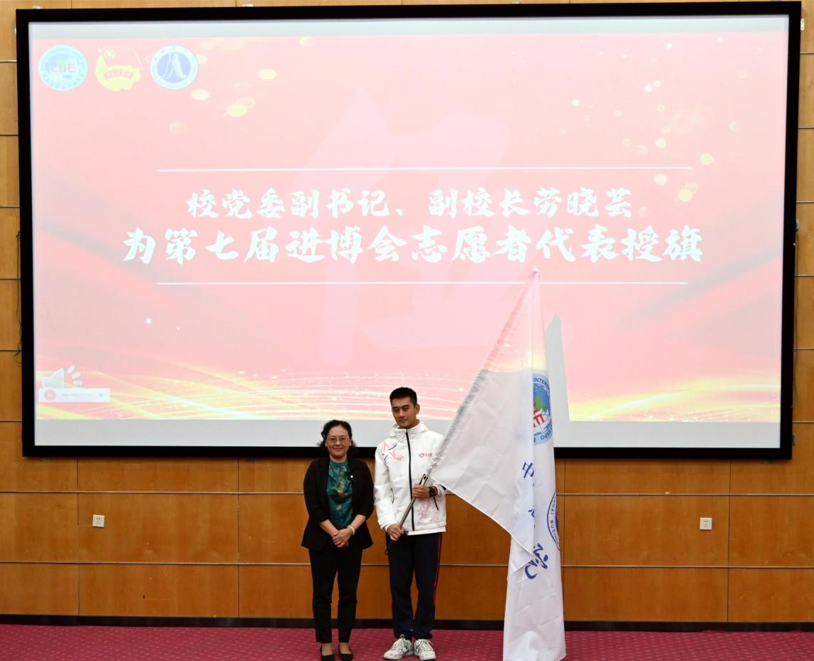 领导授旗,激励奋进。校党委副书记、副校长劳晓芸为进博会志愿者代表张越授旗并对本届进博会志愿服务工作提出要求与希望:一是提高政治站位,勇担时代使命,依托志愿者临时党、团组织,发挥“小叶子”之家的阵地作用,以坚定的信心、饱满的热情、奋发的姿态投身志愿服务,勇担使命,增长才干;二是坚持对标一流,展现青春才华,用所学知识服务进博,进一步领略世界先进技术、开放理念、实践成果,为今后的专业学习与科研提升打下坚实基础;三是投身发展大局,谱写青春华章,从服务国家战略的角度出发,积极助力上海城市服务保障各项任务,以志愿者工作的“越做越优”,助力进博会“越办越好”。