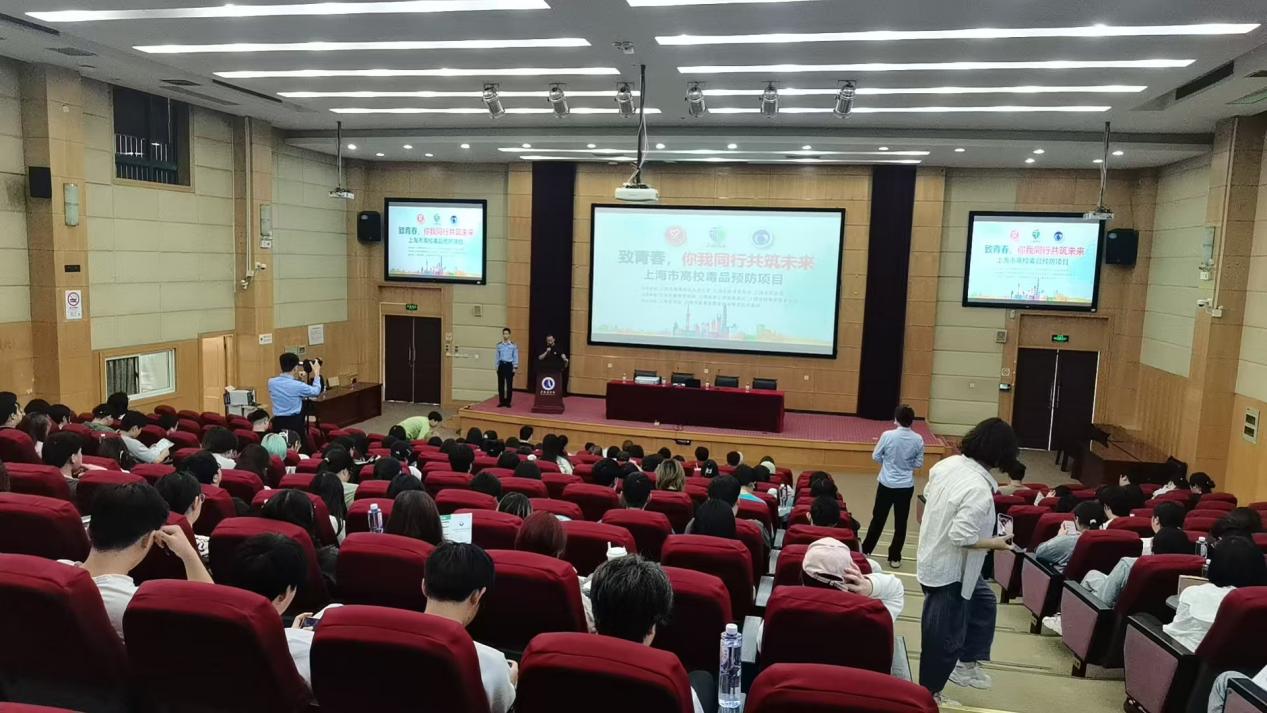为深入贯彻习近平总书记关于禁毒工作的重要指示精神,积极应对当前毒情形势变化,进一步筑牢高校禁毒防线,提高大学生识毒拒毒防毒能力,上海市禁毒委员会办公室、上海市教育委员会、上海市司法局共同推出的“致青春、你我同行共筑未来”高校毒品预防项目全面启动。6月3日下午在我校奉浦校区130报告厅顺利举办“一校一课”毒品预防教育培训活动,参与同学近200人。