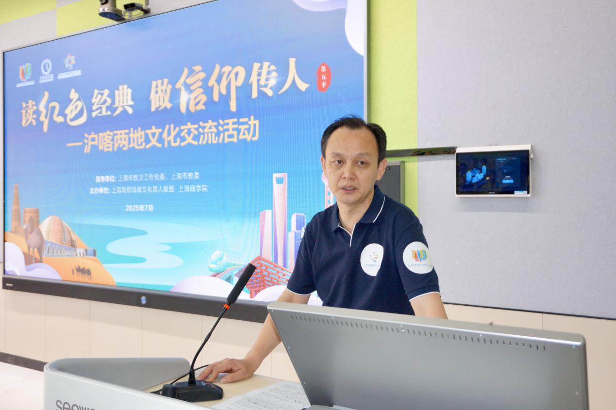 在新疆维吾尔自治区成立70周年、上海援疆15周年、上海商学院建校75周年这一具有多重纪念意义的重要历史节点上,由上海市教卫工作党委、上海市教委指导,上海商学院、上海高校阅读文化育人联盟和上海市对口支援新疆工作前方指挥部主办,上海市志愿服务公益基金会、喜马拉雅等联合承办,开展了为期五天的“读红色经典 做信仰传人(第五季)”之沪喀两地文化交流活动。上海商学院党委副书记、副校长劳晓芸,上海科技大学党委副书记吴强,上海大中小学思政教育一体化建设创新发展中心兼职教研员邹竑等大中小学教师组成的专家授课团队一行15人于7月21日-25日跨越山海,走进喀什。