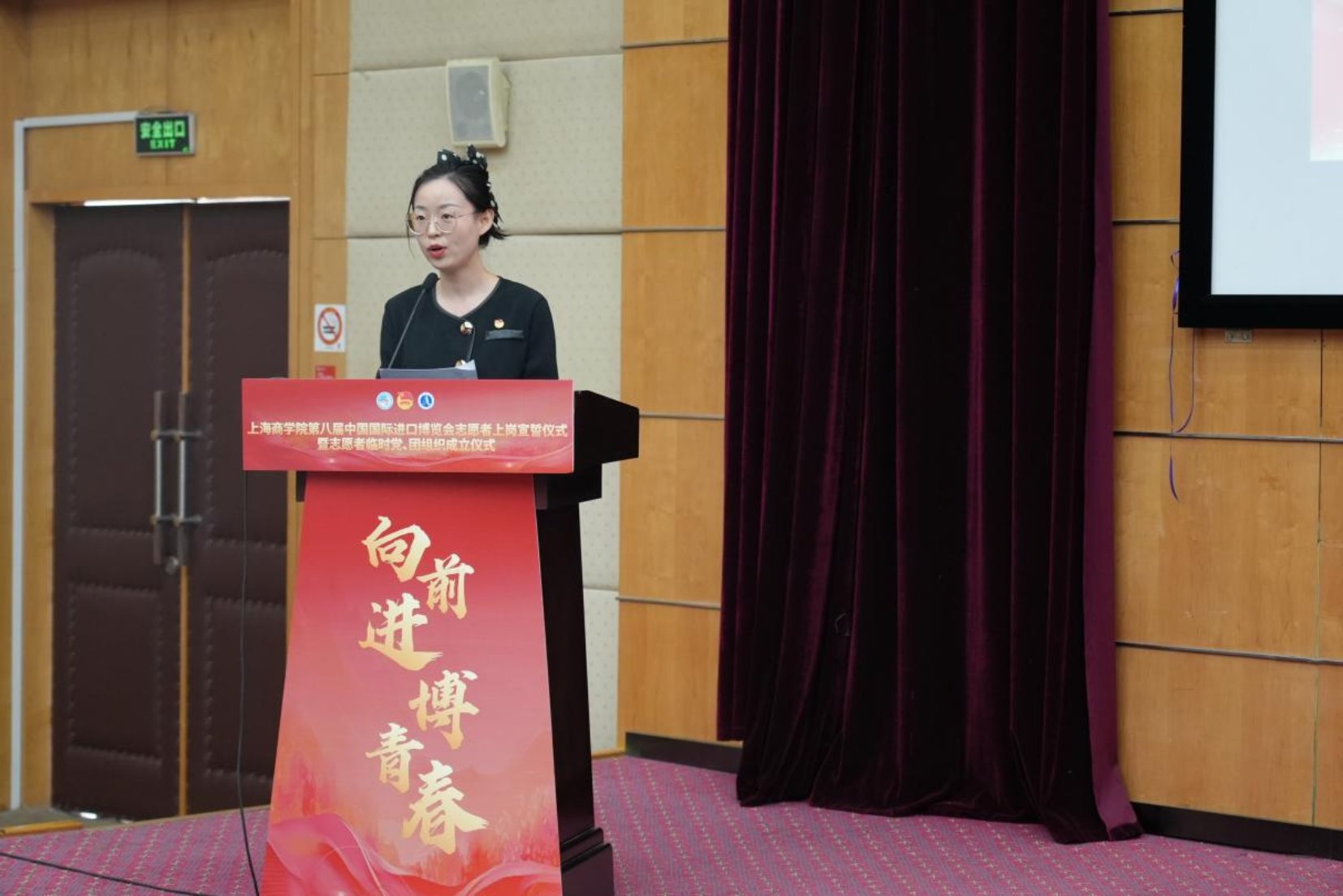 图为校团委副书记邹亚妮介绍本届进博会的前期筹备工作