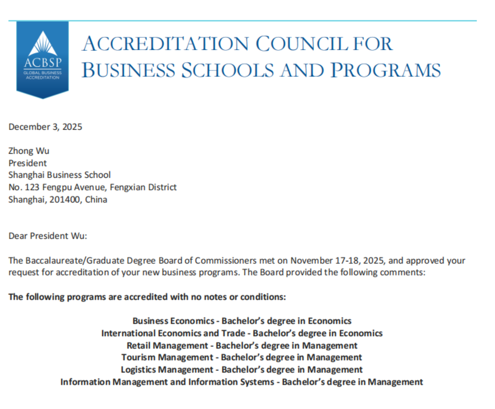 2025年12月3日,商务经济学院国际经济与贸易、商务经济学专业顺利通过国际商科教育认证委员会(ACBSP)的评审,正式获得认证。此次认证的通过,标志着两个专业的教学质量与人才培养体系已具备国际认可的专业水准,是我校在推进商科教育国际化与高质量发展进程中取得的一项重要成果。