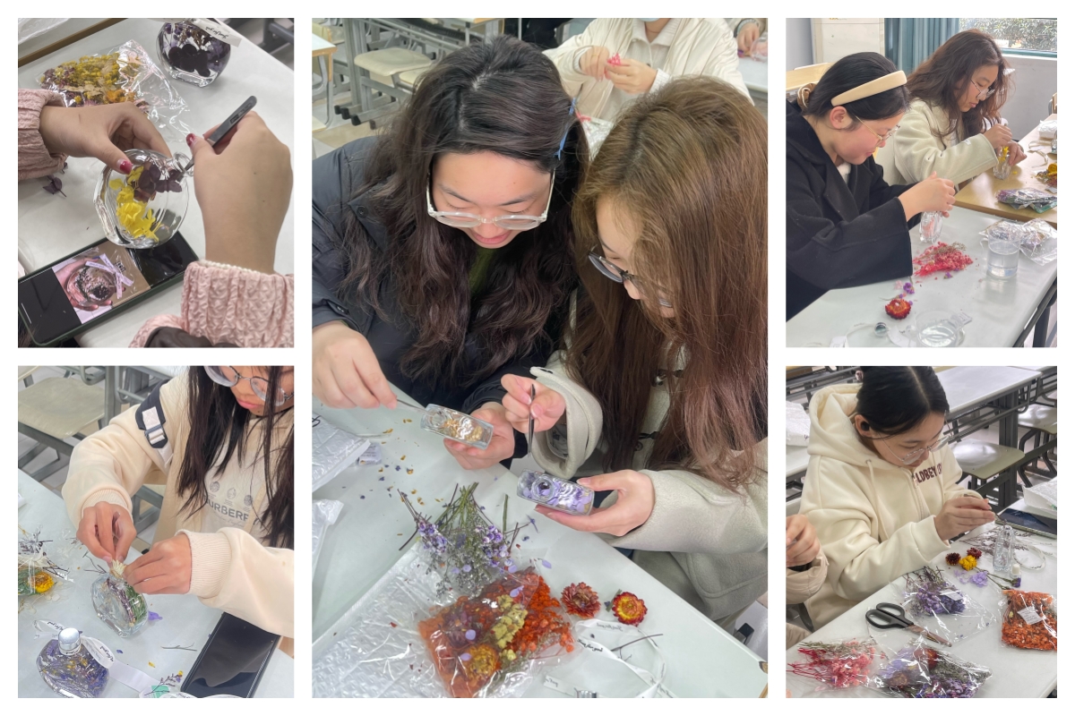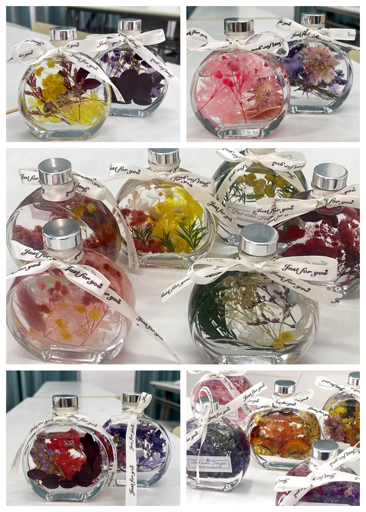 永生花寓意着永恒的美丽与坚韧,同学们将永生花浮游瓶赠予身边女性,传递节日的美好祝愿,希望她们在岁月的长河中永远绽放光彩。