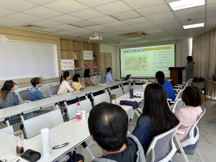 杨苗捷首先和在座的教师们介绍了商务英语系大学英语教研室近期在课程思政建设方面取得的一系列成果。稍后,杨老师向在座教师分享了《理解当代中国英语读写》教材的基本情况,包括教材设计、教学资源、数字课程等,也介绍了《理解当代中国英语读写》教材融入大学英语课程的具体做法,例如大学英语老师集体备课撰写单元教学设计、汇编理解当代中国术语与诵读素材以及大学英语课程思政评价体系的构建等。