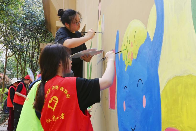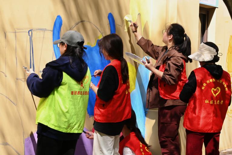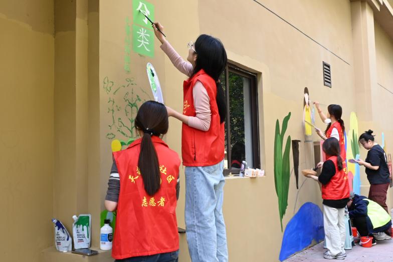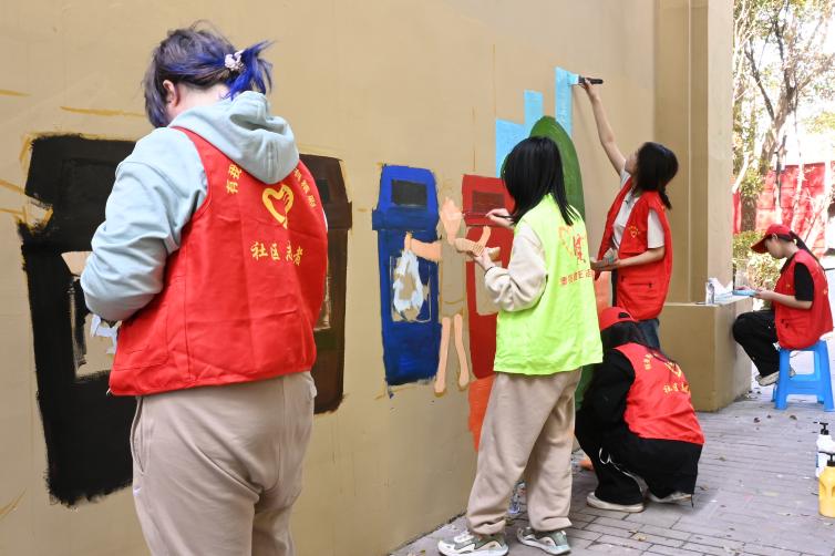 活动采用“党团先锋队+美育+志愿服务”三维联动机制,将学生们的专业特长与社区需要进行深度融合。志愿者们在工作人员的带领下绘制垃圾分类的相关画作,以墙绘为途径,生动展示垃圾分类的重要性。同时成员与社区居民协同创作,将四色分类标识融入抽象艺术构图,通过从点到面的艺术创作手法打造兼具实用指引与美学价值的环保文化墙。