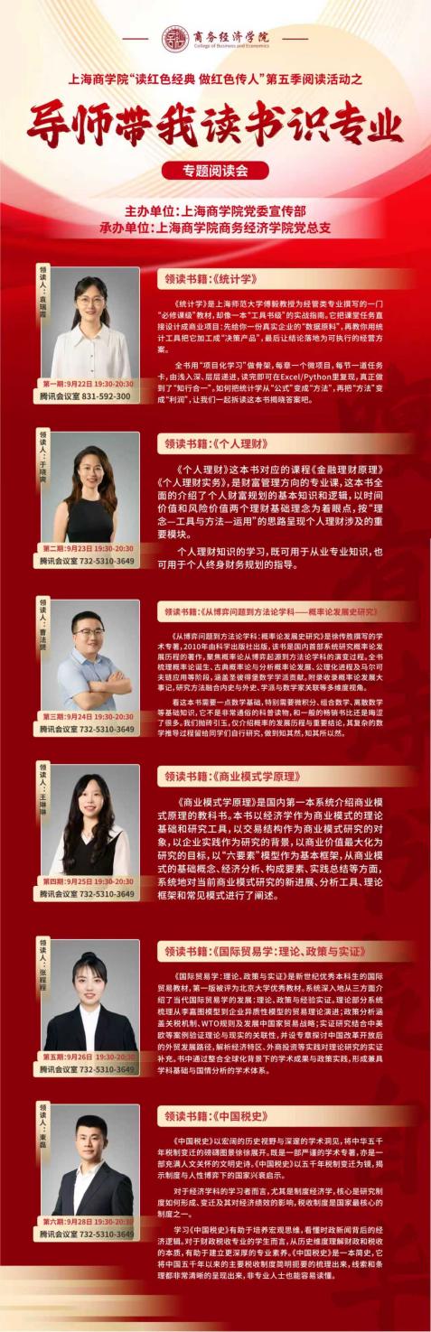 时值纪念中国人民抗日战争暨世界反法西斯战争胜利80周年之际,在这承载民族记忆的金秋时节,商务经济学院迎来了2025级400余名新生,又为学院蓄足了青春力量。为深入学习贯彻落实全国及上海教育大会精神,不断推动立德树人育人机制建设,助力商经新生快速适应新环境新要求,激发广大青年强国有我的青春激情,商务经济学院党总支以学业导师为抓手,引导党员教师积极打通第一课堂和第二课堂,组织开展本次专题读书活动。本次活动由上海商学院党委宣传部主办,商务经济学院党总支承办。本次阅读活动安排六期,每期领读书籍与我院设置专业高度相关,领读导师皆为各教师党支部推荐的党员导师代表,他们不仅是深耕自身领域的研究者,更是教学创新积极实践者,也是学生创新创业引领者。