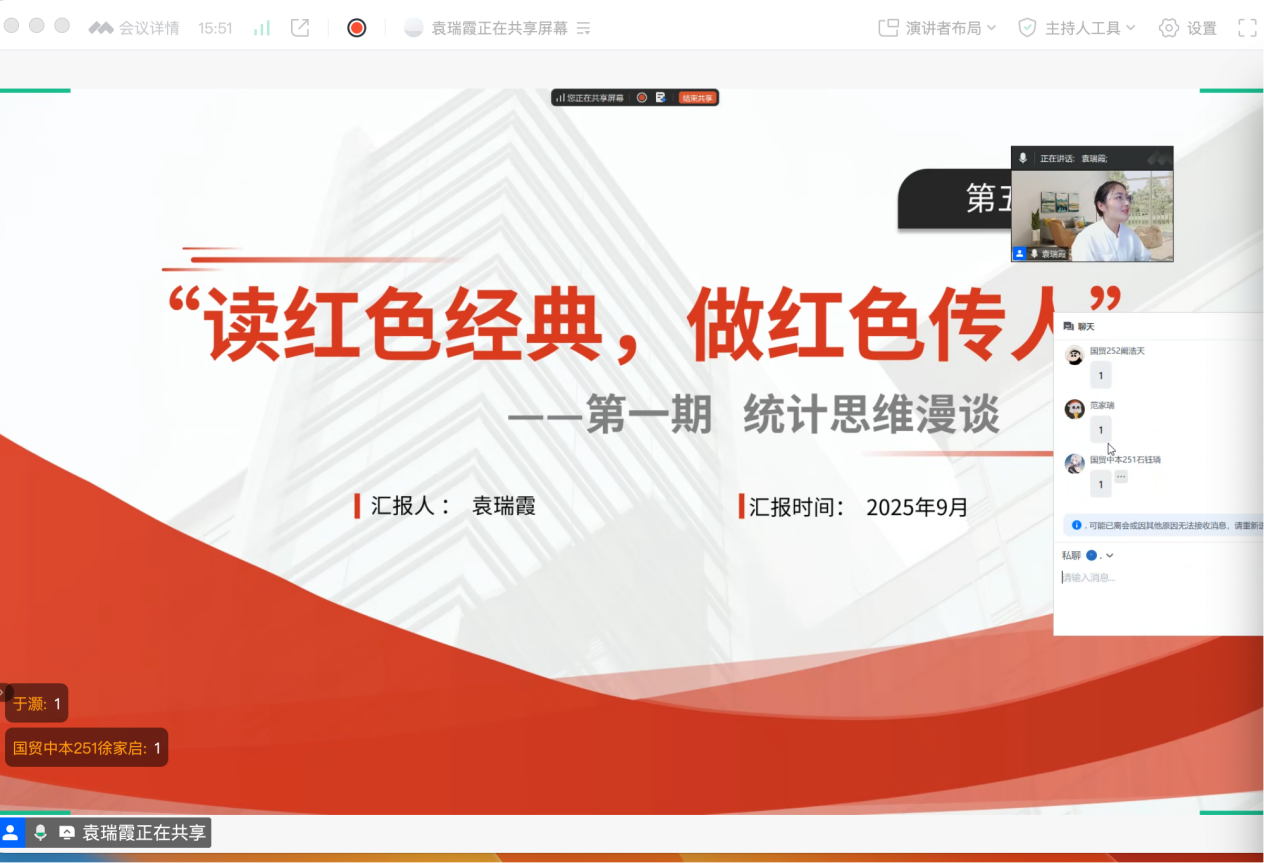互动交流环节中,学生围绕统计学的应用领域、数据样本分析等内容踊跃提问。活动尾声,袁老师以统计大师 C.R.Rao的名言 “在理性的世界里,所有的判断都是统计学”强调统计思维不仅是学科知识,更是认知世界的重要工具。袁瑞霞老师鼓励同学们以统计思维为翼,在学习与实践中锤炼能力,成为兼具科学素养与责任担当的新时代接班人。此次专题读书分享会将红色传承与学科思维相结合,既普及了统计学知识,又传递了求真务实的科学精神,为后续系列活动奠定了良好基础。