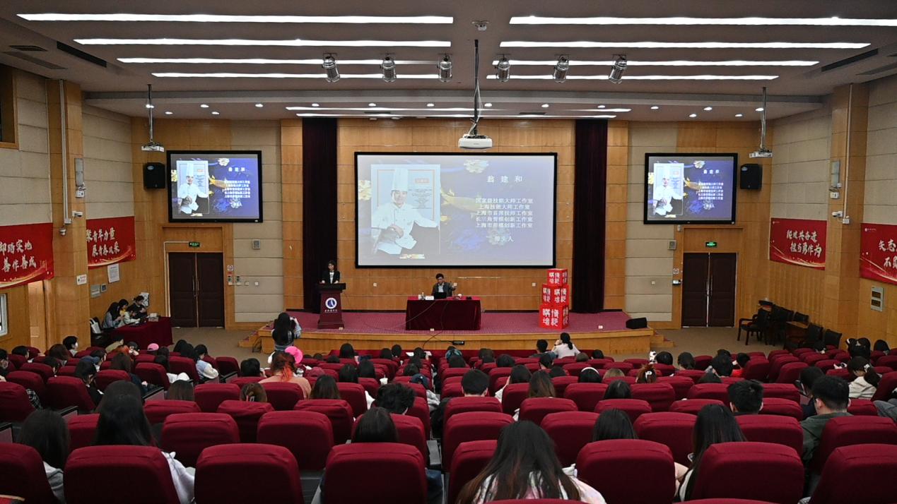 翁建和以“工匠精神和国宴接待的创新突破”为主题和同学们分享自己千里“投喂”援鄂医疗队与服务第二届进博会的工作经历。