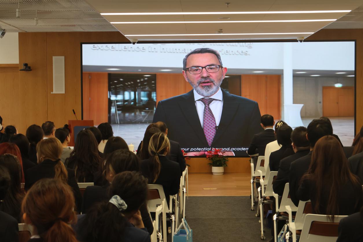瑞士EHL集团首席学术官Juan PERELLON博士通过视频连线致辞。他以“卓越非偶然,而是一场持续探索的旅程”为核心,鼓励新生在未来的学习生涯中积极迎接挑战、勇于突破自我,在泛服务业领域书写独特的成长篇章。