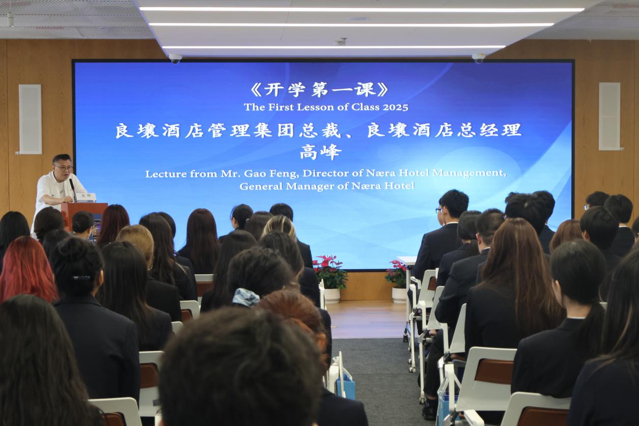 随后,新生开学第一课正式启动。学院特别邀请了高峰先生,以“酒店职业精神和人生感悟”为主题展开分享。他结合自身丰富的行业经验,借助三组关键数据与三大行业案例,为新生带来了生动的行业启蒙,引导新生深入理解酒店行业的核心与要义。最后,他希望新生能做到“会听话、能吃苦、会做事”,让一年的365天每天都有新收获、新成长。此次开学第一课,不仅为新生开启了专业领域的第一次深度认知,也在精神层面为他们锚定了成长航向,激励其以良好的状态在未来勇毅前行,为酒店及泛服务业发展贡献力量。