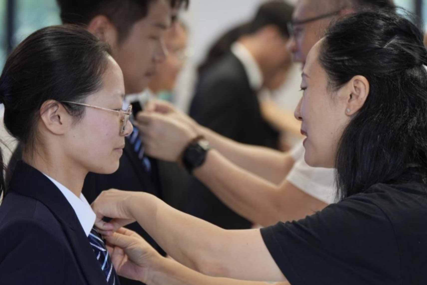 在众位嘉宾与师长的瞩目下,新生代表登台,进行校徽授予仪式,瑞方、企业方及校方代表共同为新生代表佩戴校徽。这不仅是“上海洛桑人”身份的象征,更承载着“厚德博学、经世济民”的校训精神,传递着各方对新生的殷切期望。
