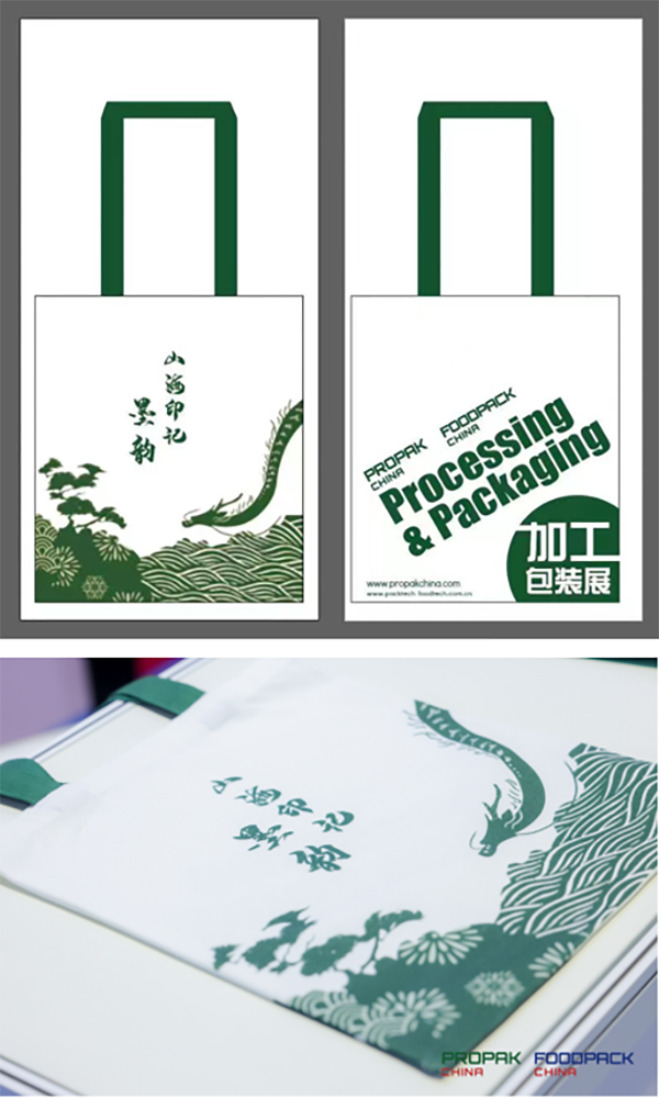 大赛和联展活动期间,主办方高度重视学生设计成果的市场应用与转化,积极搭建包装创新实践成果的高端展示平台,主办方遴选出了视觉传达设计专业刘隽洁同学设计作品,设计制作成展会伴手礼---《山海印记·墨韵》手提袋,赠送来自国内外参展的四方宾朋、八方来客。