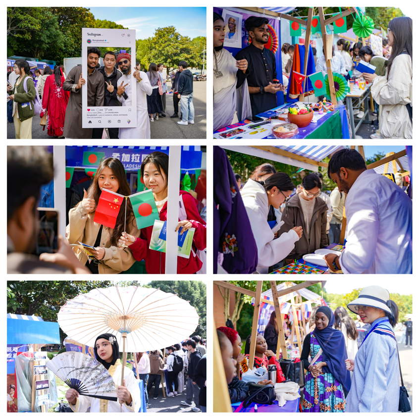 10月29日,上海商学院奉浦校区食堂门口广场热闹非凡,来自中国、俄罗斯、蒙古、摩洛哥、乌兹别克斯坦、柬埔寨、越南、巴基斯坦等20多个国家800多名师生欢聚一堂,共同开启一场别开生面的中外文化融合体验之旅。