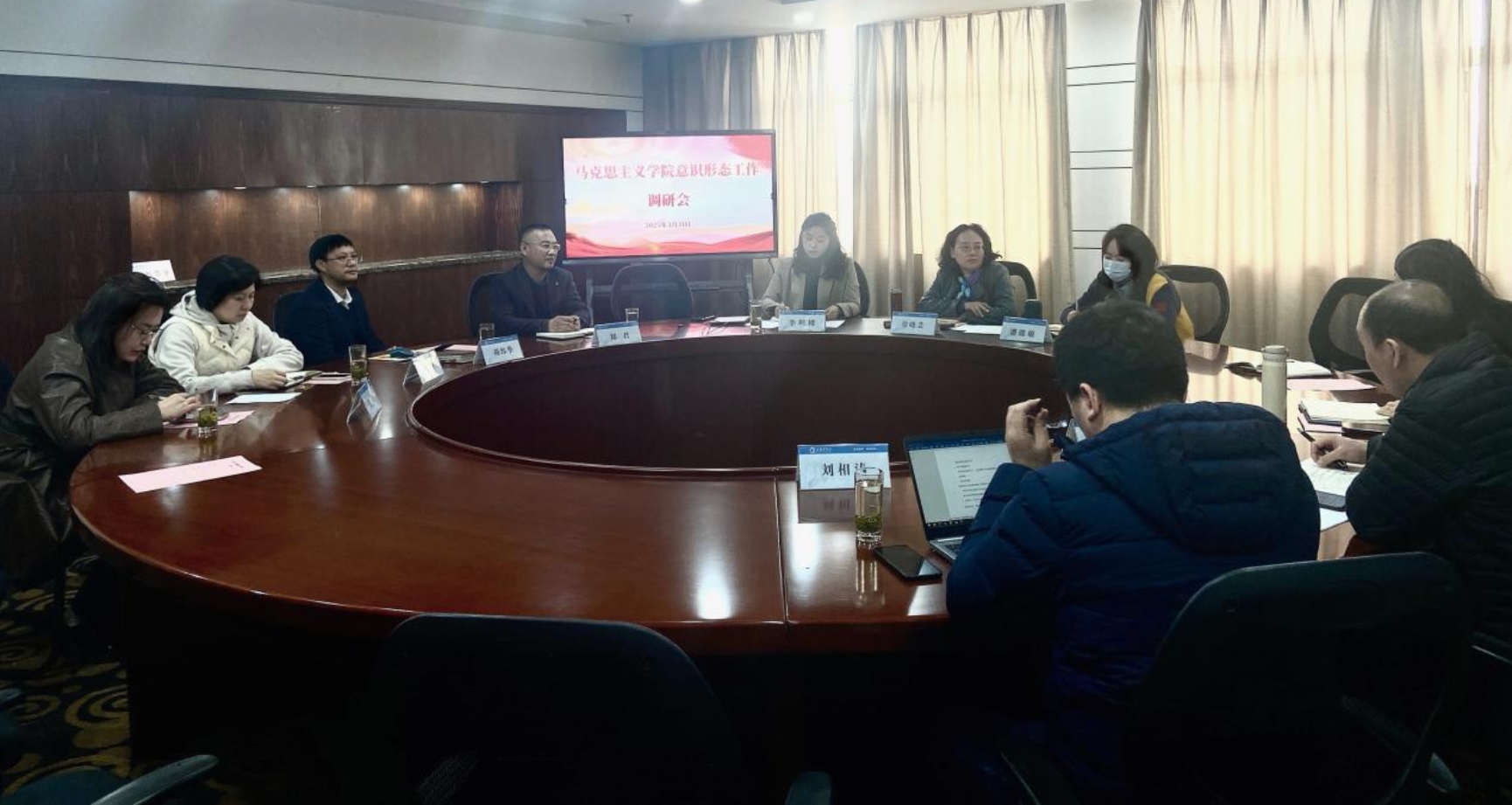为进一步强化意识形态工作责任制,把牢舆论导向,做好阵地建设。3月31日,校党委副书记、副校长劳晓芸赴马克思主义学院调研意识形态工作,校党委宣传部副部长潘懿敏、党委宣传部李坦楼陪同调研。会议由马克思主义学院直属党支部书记胡纬华主持。马克思主义学院领导班子、直属党支部支委以及办公室人员参加调研。