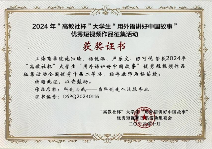 在全国活动环节,上海洛桑酒店管理学院酒店管理(中外合作办学)231本科班施沁琦、杨悦涵、严乐文、陈可悦的“科创与我——当科创走入泛服务业”短视频(指导教师:杨苗捷)喜获全国优秀作品二等奖的好成绩!