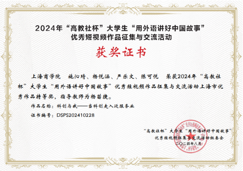 2024年“高教社杯”大学生“用外语讲好中国故事”优秀短视频作品征集活动经过上海商学院校级初赛,推选出两个校级一等奖优秀短视频作品“皮影艺术:古今交融”和“科创与我——当科创走入泛服务业”参加市级遴选与推荐活动。我校上海洛桑酒店管理学院酒店管理(中外合作办学)231本科班施沁琦、杨悦涵、严乐文、陈可悦的“科创与我——当科创走入泛服务业”短视频荣获上海市优秀作品特等奖(指导教师:杨苗捷),我校商务英语22级、21级本科班叶奕廷、沈佳怡,周伊加,李忻祺的“皮影艺术:古今交融”短视频荣获上海市优秀作品一等奖(指导教师:吴慧珍、尚华)。