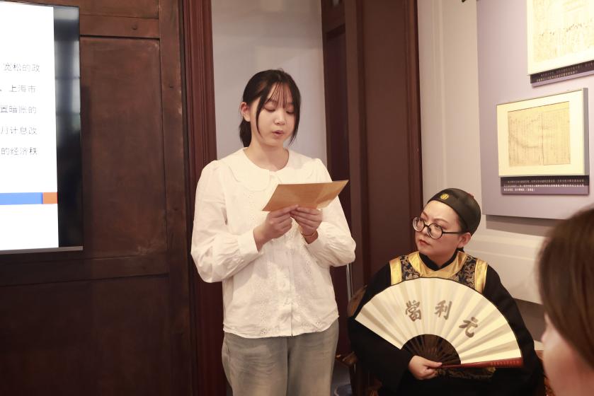 “故事聆听”中大小朝奉的生动演绎,向在场的师生缓缓铺开了一幅关于元利当铺曲折而又辉煌的历史长卷,党支部的几位学生党员也参与到故事讲述的环节中。1946年,元利当铺曾一度陷入停业的困境。然而历史的车轮滚滚向前,新中国成立后,它迎来了新的转机,融入了公私合营的浪潮中,改革开放的春风更是为它注入了新的活力,当铺重新复出,焕发出了前所未有的生机与光彩。“大朝奉”指出,典当作为一种古老而又灵活的融资方式,曾帮助无数家庭和个人渡过难关,实现了“典之所用,当之所及”的宗旨。典当不再是被传统观念所误解的剥削工具,而是一种充满人性关怀和社会责任感的金融服务,使大家对典当业有了全新的认识。